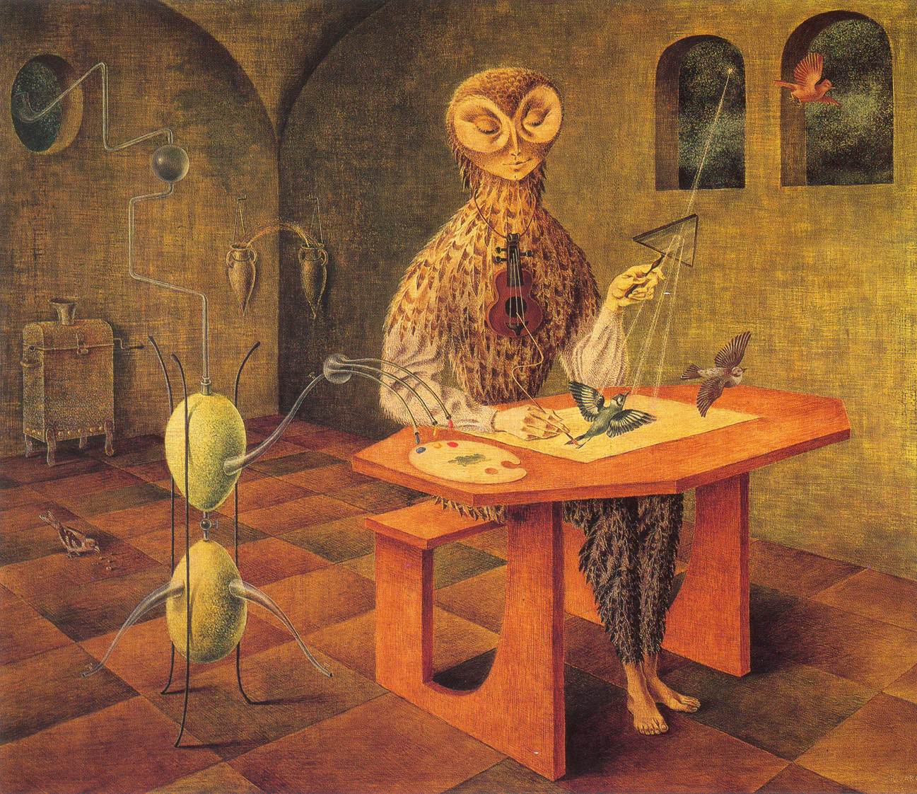 El pincel da vida pues es una conexión con el alma, haciendo que lo que se pinta tenga su propio espíritu a pesar de lo plano de la superficie. Esta conexión entre el pintor y su pintura es el sentido creacionista de la obra “La Creación de las aves” de Remedios Varo. La carga simbólica de este cuadro lo hace una de mis pinturas favoritas y sin duda la más icónica de la pintora española, por lo que en este texto -más que hacer un análisis semiótico de los elementos- describiré mi interpretación tomando como base la cultura y el contexto en el que estoy inmerso en este siglo XXI.